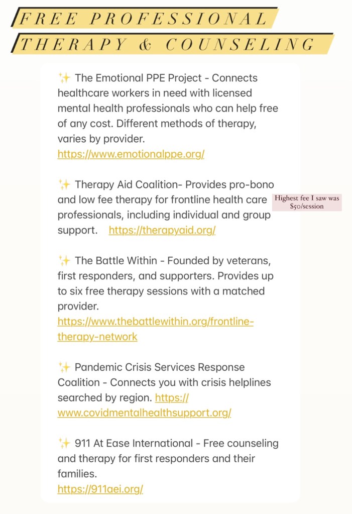Anything from low cost to free therapy/counseling. Also, several peer-to-peer programs. These are in no way sponsored nor a definitive way on how to manage any mental illness. These are simply resources I’ve found helpful along the way and wanted to share.
