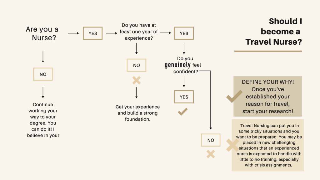 - If you answered no to any question, you should probably not be pursuing travel nursing. Give yourself some more time, a stronger foundation, and gain more confidence.