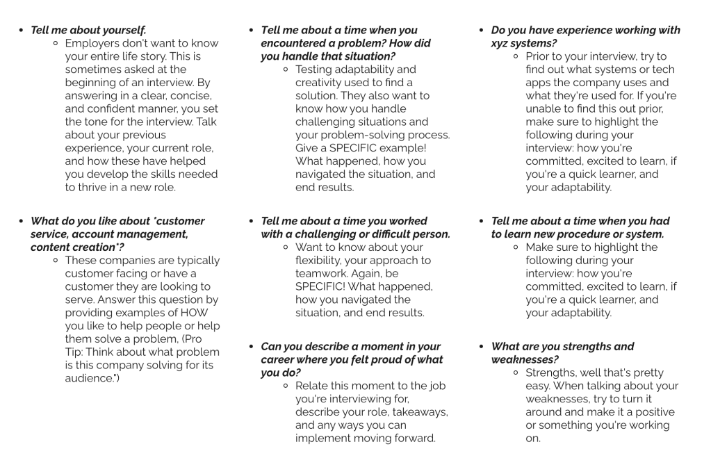 Their questions will ask about your teamwork, how you handle challenges, customer service, commitment to learn, your flexibility, and adaptability. And most like to know that you have familiarized yourself with the company and their values/missions. They want to know they are hiring someone that will support their company’s goal and that will bring value to the team.
